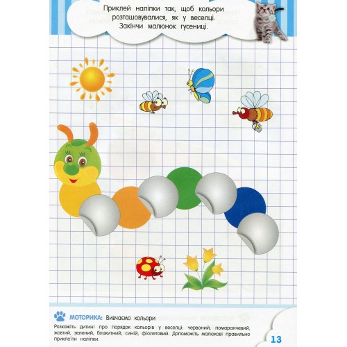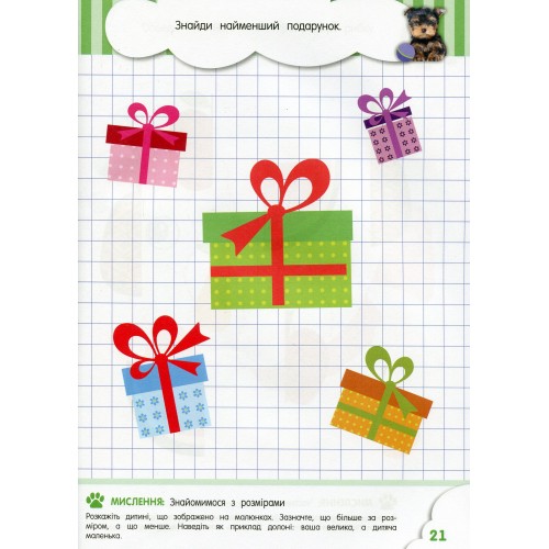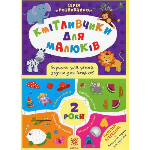 Серія книжок із розвивальними завданнями для дошкільнят «Розвивайко» поповнилася книжечкою для зовсім маленьких кмітливчиків 2 років! У книзі на одній сторінці розміщено по одному завданню, яскраві малюнки та цікаві вправи, а внизу розташовані методичні рекомендації, які допоможуть дорослому правильно зорієнтувати малюка. Книга має всі типи завдань, необхідних для гармонійного розвитку маляти, яке робитиме перші кроки у пізнанні кольорів, спробах логічно мислити, розвивати мовлення та тренувати дрібну моторику руки, виконуючи різноманітні завдання та вправи. Більшість завдань малюк зможе виконати сам, але якщо йому буде складно, то допоможуть підказки батьків, які прочитають їх у книзі! Внизу кожної сторінки із завданням є поради педагога: на що слід звернути увагу дитини, як підказати їй шлях до розв’язання завдання тощо.