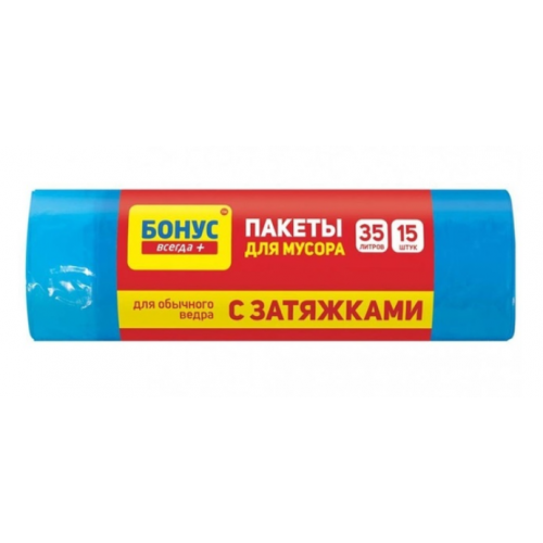 Пакети для сміття Бонус HD з затяжкою 35 л 15 шт ефективно полегшують прибирання з подальшим вивезенням різних відходів. Вироби виконані з якісного поліетилену, з зручними затяжками і відмінно підійдуть для стандартного відра . Об'єм: 35 л Кількість в упаковці, шт: 15.
