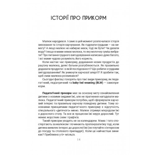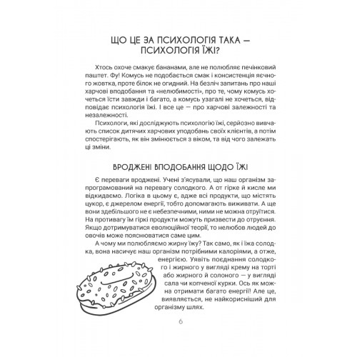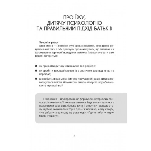 Книжка присвячена питанням психології їжі. Вона містить поради психолога щодо організації здорового харчування дитини та дорослих членів сім’ї, формування гарних харчових звичок та коригування неправильної харчової поведінки. Завдяки простим алгоритмам батьки навчать малюків їсти корисні страви самостійно, без істерик, із задоволенням, і не тільки в родинному колі, а й у дитячому садку.
