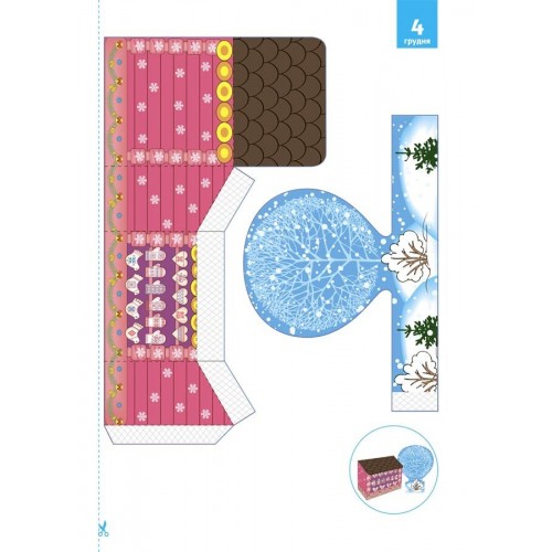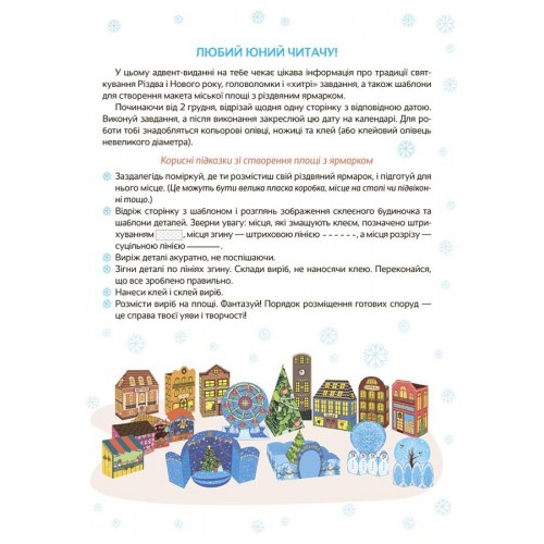 Створюємо дива власноруч та готуємося до зимових свят. Творчий зошит з поробками та завданнями для дітей 6-8 років. Перед вами — дитячий простір для творчості, побудований за принципом адвент-видання. На його сторінках на дітей чекають 15 поробок та 15 завдань на кожен день очікування зимових свят. Кожна поробка перетворюється на макет споруди або будівлі, з яких можна створити міську площу з різдвяним ярмарком, що стане окрасою будівлі на свята Наше творчий адвент-зошит допоможе організувати сумісне родинне дозвілля та перетворити очікування свят на справжню зимову пригоду. Розгортайте адвент-зошит та створюйте дива власноруч.