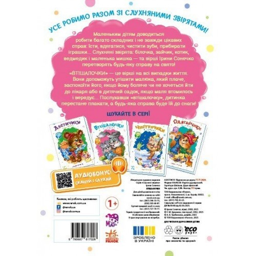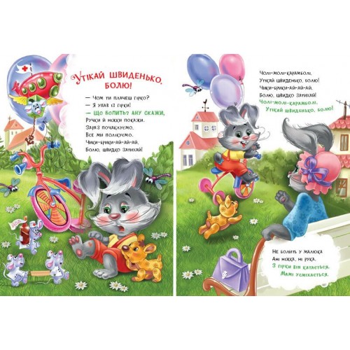 Це вірші-втішалочки на всі випадки життя. Вони допоможуть утішити малюка, який плаче, заспокоїти його, якщо йому боляче, не хочеться йти до лікаря або в дитячий садок, якщо маля втомилось і вередує… Послухавши «втішалочку», дитинка перестане плакати, а будь-яка справа буде їй під силу!
