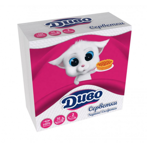 Двошарові серветки Диво виготовлені з 100 % целюлози. Це екологічно чистий папір, санітарно-гігієнічного призначення. Даний матеріал дуже легкий і прекрасно поглинає вологу. Саме тому серветки столові Диво мають високу ступінь надійності і будуть дбати про чистоту і здоров'я людини без особливих зусиль. Продукція Диво завжди актуальна і корисна на всі випадки життя. Серветки виготовлені в класичному білому виконанні і тому зможуть відмінно поєднуватися з будь-якими квітами скатертини при сервіруванні святкового, або банкетного столу.