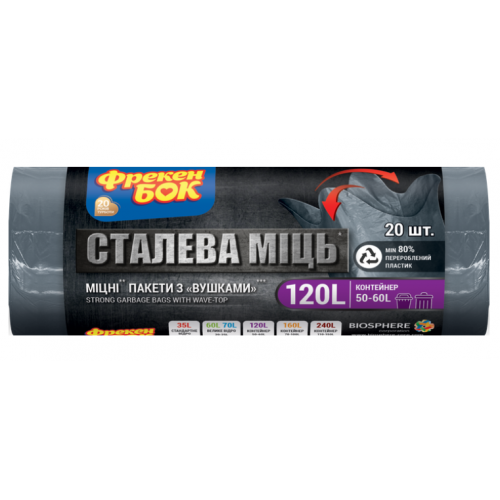 Пакети для сміття з вушками Фрекен БОК міцні пакети Сталева Міць 120 л, чудово підійдуть для контейнера 50-60 літрів.