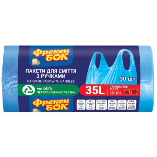 Стандартні пакети для сміття з ручками для господарських цілей (пакування, зберігання, транспортування нехарчових продуктів, сміття). Обсяг -35л Для стандартного відра 12-15л Зручні, міцні, надійні Покращена щільність -11мкм забезпечує міцність пакета. Спеціальні ручки для максимальної зручності при винесенні сміття. Збільшена корисна площа пакету. Універсальні у використанні. Виготовлені з повторно переробленого пластика.