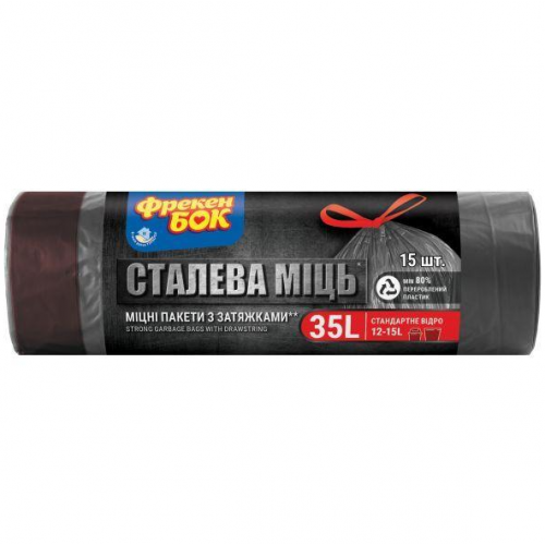 Пакети для сміття Фрекен БОК Cталева МІЦЬ 35 л чудово підійдуть для стандартного відра 12 -15 літрів. Матеріал: 80% перероблений пластик.