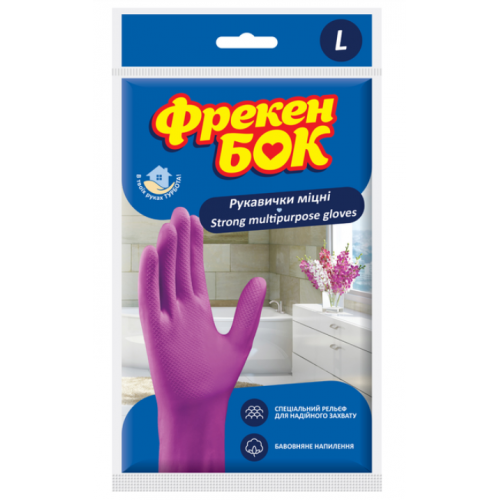 Універсальні суперміцні рукавички торгової марки Фрекен БОК забезпечують максимальний комфорт і зручність під час різних господарських робіт. Рукавички мають внутрішнє бавовняне напилення, яке знижує ймовірність виникнення алергічної реакції. Спеціальна рифлена поверхня дозволяє утримувати слизькі і мокрі предмети. Призначені для миття посуду, прання білизни, догляду за тваринами, чищення овочів.