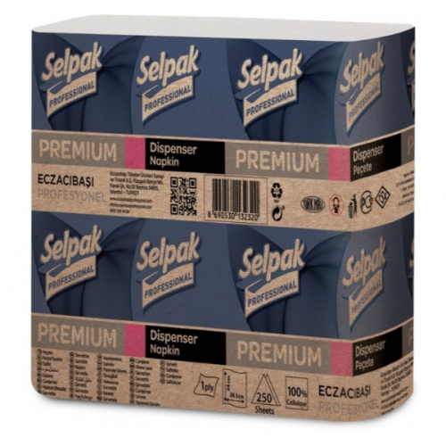 Selpak Professional Premium Серветки для диспенсера 250 штук. Серія - Premium; матеріал - целюлоза; щільність - 18 г / м2; кількість шарів - 2; кількість аркушів - 250; розмір аркуша - 26х24 см; колір білий; вкладення в групову упаковку - 18 уп Рекоменудєтся використовувати в Selpak Pro Пластиковий тримач паперових серветок - артикул 57100720. Диспенсерні серветки Selpak Professional виготовлені з високоякісної целюлози, не прилипають, не залишають волокна на обличчі або руках, добре вбирають вологу. Серветки підходять для всіх видів диспенсерів. Спеціальне складання дозволяє використовувати серветку як в диспенсері, так і без нього. Такі серветки допомагають економити час для сервірування столу, знизити витрати. Завдяки конструкції диспенсера, дістається лише одна серветка, відсутній контакт з іншими серветками, забезпечується захист від пилу і бруду. Диспенсер вміщує 100-200 серветок, що дозволяє оптимізувати роботу і не витрачати час на його поповнення. Зони застосування: місця з великою прохідністю, зали ресторанів, шведський