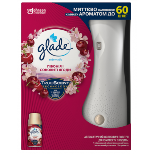 Glade Півонія і Соковиті ягоди. Цей продукт, створений з автоматичною функцією випуску аромату та можливістю підсилення, майстерно розроблений, щоб дарувати вам яскравий сплеск аромату пелюсток півонії, стиглої вишні та нот білого дерева кожні 9, 18 або 36 хвилин — коли забажаєте. Налаштуйте і забудьте, насолоджуючись свіжістю, що триває до 2 місяців*.