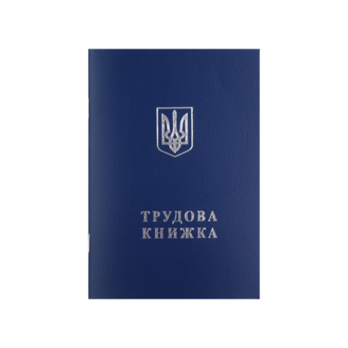 Трудова книжка суворої звітності з пропечатаною тангірною сіткою і нанесенням голограми. Формат А6 32 аркуші Обкладинка виготовлена з бумвінілу (синього кольору з нанесенням геральдики) Блок виготовлений на офсетному папері щільністю 70 г/м². Друк 1 + 1 Кріплення на дві скоби Персональна нумерація всього блоку