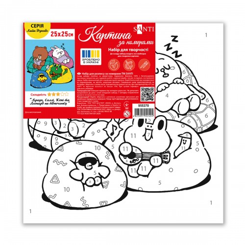 Картина за номерами ТМ SANTI "Лайн Френдс. Браун, Саллі, Коні та Леонард на відпочинку" - це можливість створити мальовничий шедевр без спеціальної підготовки. Точні пронумеровані контури на полотні допоможуть легко орієнтуватися у процесі малювання. Такий формат також сприяє швидкому освоєнню та запам'ятовування цифр в ігровій формі — дитина асоціюватиме їх з яскравими фарбами та елементами малюнка, що робить навчання простим та веселим. У наборі використовуються акрилові фарби, вони легко лягають на полотно, швидко висихають, дозволяючи дитині побачити результат одразу після завершення роботи. Набір для творчості виготовлений з натуральних, екологічно чистих матеріалів, що робить малювання комфортним і безпечним навіть для найменших художників.