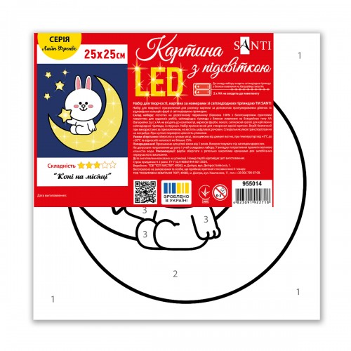 У кожній картині за номерами ТМ SANTI представлені цікаві та знайомі дітям персонажі, які перетворюють малювання на справжню пригоду. Дитина зможе відтворити на полотні сцени з улюблених мультфільмів, коміксів та ігор, намалювати милих звірят або яскраві фантастичні світи, а світлодіодна гірлянда з LED елементами, що підсвічують картину, надасть їй неймовірного ефекту живого сюжету. Для зручності в набір включені спеціальні клейові силіконові краплі, на які легко та надійно кріпиться світлодіодна гірлянда. Картина з LED елементами може використовуватися не тільки як декор, але і як нічник, прикрашаючи та доповнюючи ваш інтер'єр. Дитина не тільки отримає задоволення від творчого процесу, а й зможе з гордістю прикрасити свою кімнату власним шедевром із улюбленими героями!