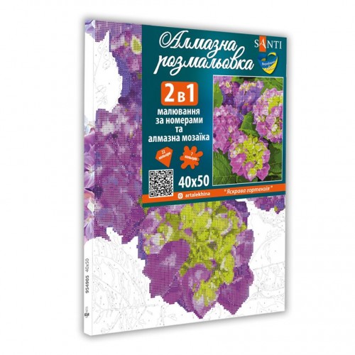 Створіть власний шедевр завдяки унікальному набору для творчості, який об'єднує два популярних хобі. Полотно комбінованої алмазної мозаїки потрібно частково розмалювати акриловими фарбами, а також частково заповнити кольоровими камінцями і це надасть вашій роботі неймовірний 3D-ефект. Ваша власна майстерність об'єднає алмазні камінці та акрилові фарби, створюючи твір мистецтва, який прикрасить ваш інтер'єр. Ваше мистецтво - це ваша унікальність. Картина за номерами з алмазною мозаїкою SANTI Яскрава гортензія. Зверніть увагу! Кольори акрилових фарб та камінців можуть відрізнятися від зображених на фото в залежності від налаштування машого монітору. Склад набору: 1. Полотно з клейкою основою для викладки мозаїки на дерев'яному підрамнику. 2. Контрольний аркуш для точного розміщення камінців. 3. Круглі акрилові камінці. 4. Акрилові пронумеровані фарби для розмалювання. 5. Набір пензлів для точного нанесення фарб. 6. Олівець для захоплення каменів (стілус), пластиковий піддон для камінців та силіконовий клей.