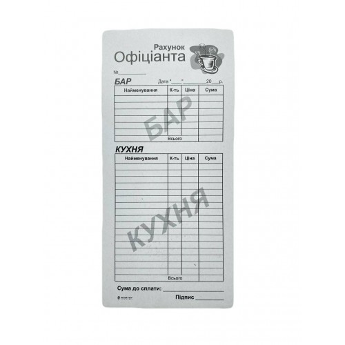 Бланк "Рахунок офіціанта" А4/3, самокопір, Бар-кухня (100арк)