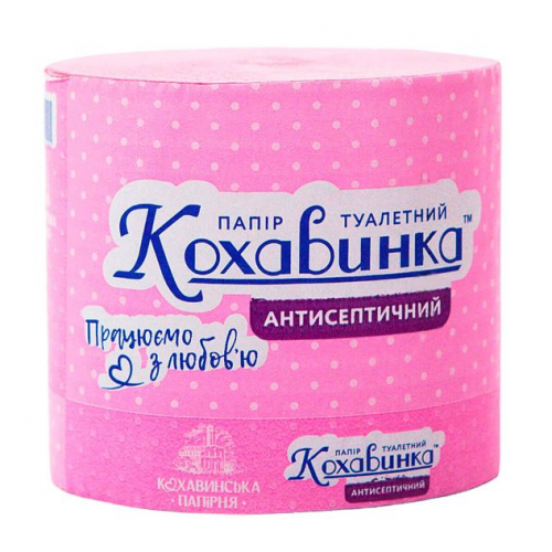 Кохавинка “Антисептичний” — це одношаровий туалетний папір без втулки, виготовлений з макулатури із додаванням очищеної целюлози. Покритий антисептичним засобом «Гембар», він має підвищені мікробіологічні властивості, забезпечуючи додатковий захист користувача. Рожевий колір і тиснення роблять його приємним на дотик.