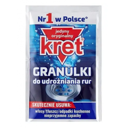 Гранули для прочистки труб Kret мініформат високоефективного засобу, що легко розчиняє засмічення органічного характеру як жир, залишки їжі, волосся тощо. Абсолютно безпечний для каналізаційної системи сифонів, згинів, з’єднувальних колін тощо. Активні компоненти максимальної дії швидко усувають головні причини забивання труб та нейтралізують неприємний запах. Важливими перевагами є зручна форма випуску, простота й економність використання. Може застосовуватись у профілактичних цілях. Продукція відомого польського виробника перевірені часом засоби, що отримали неабияку популярність завдяки ефективності та доступній вартості.