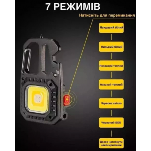 Натисніть і утримуйте кнопку на найяскравішому. Не дивіться прямо на світло діода. Маленький ліхтарик важить 46 грам і має розміри всього 8 см x 4.5 см x 2.3 см, що робить його портативним і зручним для перенесення. Яскравий ліхтарик з карабіном можна легко прикріпити до брелока або сумки. Виготовлений з високоякісного алюмінію, міцний. Підвісний гачок і регульована конструкція кронштейна забезпечують повне освітлення на 360 градусів. Крім того, можна використовувати як відкривачку для пляшок. USB-кабель для підзарядки входить до комплекту. Зазвичай для повного заряджання потрібно близько 2 годин.