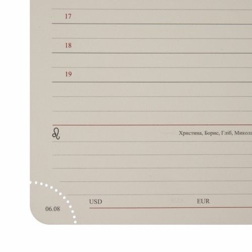 Паперовий блок продуманий до дрібниць для комфортного щоденного користування. Він налічує 368 сторінок, що забезпечує достатньо простору для щоденних записів, планів і нотаток. Папір щільністю 80 г/м² дозволяє комфортно писати ручкою чи олівцем без просвічування. Кремовий папір не втомлює очі навіть за тривалої роботи. Перфоровані кути паперового блока дозволяють легко маркувати актуальну сторінку. Це зручний функціональний елемент, що допомагає швидко орієнтуватися у записах та тримати планування під контролем. Паперовий зріз у колір паперового блока – стримане класичне рішення, що підтримує загальну гармонію дизайну. Ідеально для тих, хто надає перевагу мінімалізму.