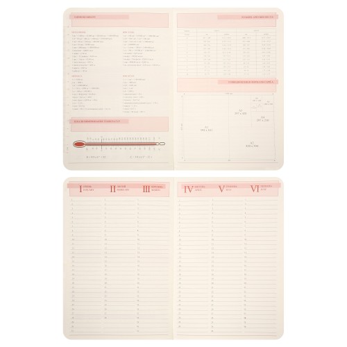 Паперовий блок продуманий до дрібниць для комфортного щоденного користування. Він налічує 368 сторінок, що забезпечує достатньо простору для щоденних записів, планів і нотаток. Папір щільністю 80 г/м² дозволяє комфортно писати ручкою чи олівцем без просвічування. Кремовий папір не втомлює очі навіть за тривалої роботи. Закруглені кути паперового блока не лише додають стильного вигляду, а й запобігають швидкому зношенню сторінок. Це практичне рішення для збереження ділового записника охайним у щоденному користуванні. Перфоровані кути паперового блока дозволяють легко маркувати актуальну сторінку. Це зручний функціональний елемент, що допомагає швидко орієнтуватися у записах та тримати планування під контролем. Кольоровий паперовий зріз додає дизайнерського акценту та візуальної виразності. Стильне рішення для тих, хто цінує оригінальність.