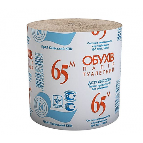Туалетний папір Обухів 65 — економічний одношаровий туалетний папір сірого кольору, виготовлений із макулатури в Україні. Без гільзи, без перфорації, без ароматів — що робить його практичним та недорогим вибором для громадських та домашніх потреб. Він підходить для ванних кімнат і добре розчиняється у воді, не руйнуючи каналізацію.