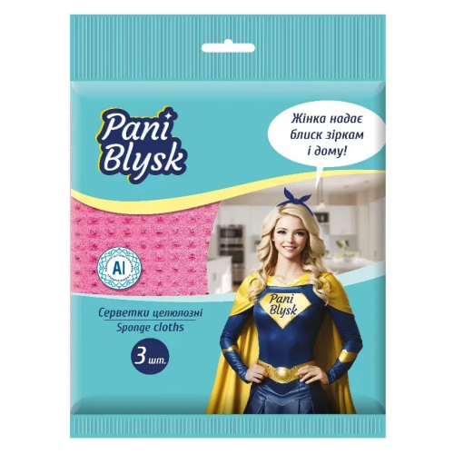 Серветки вологопоглинаючі Pani Blysk виготовлені з целюлози, завдяки чому добре вбирають вологу та утримують рідину. Призначені для всіх видів вологого збирання. Серветки стійкі до тертя та розривів, зберігають свою форму та розміри. У вологому стані серветка стає м'якою та приємною на дотик, при висиханні твердне, завдяки чому забезпечується перешкода для розмноження мікробів та неприємних запахів. Pani Blysk – українська торгова марка Корпорації "Біосфера", розроблена за допомогою штучного інтелекту. Pani Blysk - товари для дому, що надають блиску!
