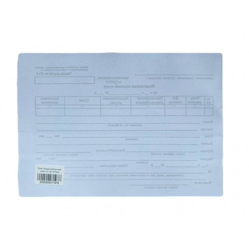 Бланк виготовлений на офсетному папері щільністю 60 гр/м2. Формат А5, Печать 1+0 Бланк проклеєний по короткій стороні в блоки по 100 арк.