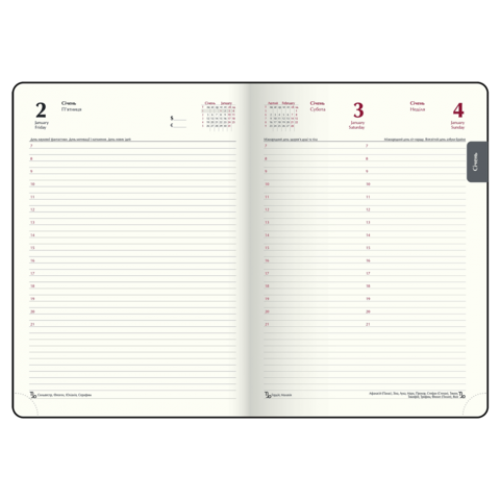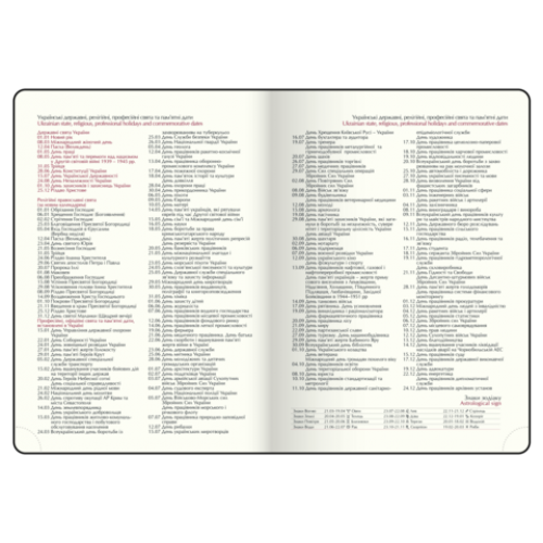 Датована сторінка на кожен день року з організатором часу від 7:00 до 21:00, календарем на поточний/наступний місяць, позначенням дня тижня, знаку зодіаку, іменинників