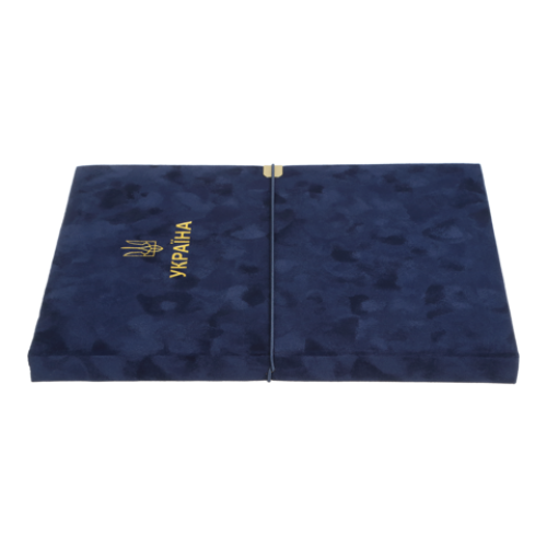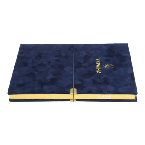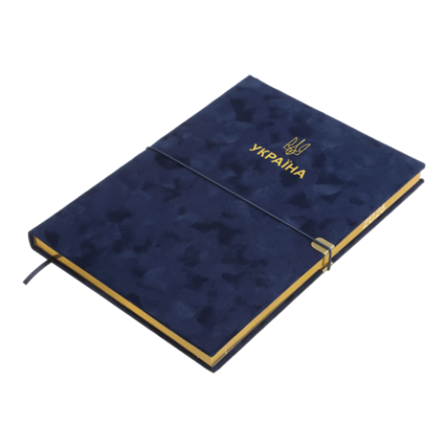 Гнучка обкладинка зі штучної шкіри з інтенсивним оксамитовим покриттям щоденника PATRIOT VELOUR виконана у розкішному стилі з національною символікою - оздоблена тисненням Тризуба та напису УКРАЇНА золотою фольгою. Дві функціональні шильди на лицьовій та зворотній стороні обкладинки з поглибленнями для поперечної гумки забезпечують зручну та надійну фіксацію щоденника в закритому стані. Гармонійно доповнює та збагачує дизайн щоденника тонований золотом зріз внутрішнього блоку з нанесенням року.