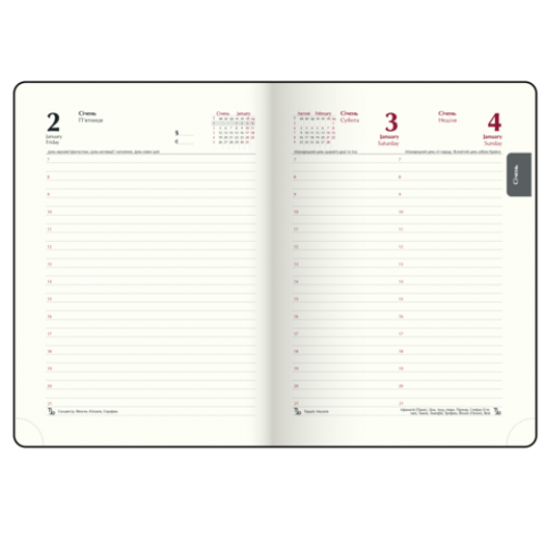 Датована сторінка на кожен день року з організатором часу від 7:00 до 21:00, календарем на поточний/наступний місяць, позначенням дня тижня, знаку зодіаку, іменинників
