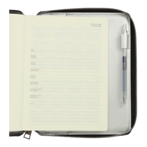 Щоденник PRIMAVERA - це дуже стильний аксесуар та незамінний помічник сучасної людини. Знімна обкладинка зі штучної шкіри з поролоном виконана у вигляді клатчу, який закривається на сріблясту блискавку. Це дуже зручно - адже так щоденник надійно фіксується в закритому стані. На внутрішній стороні обкладинки розміщені завіс для ручки, а також клапан-кишеня, на якому розташовані 3 відділення для візиток, карток та дрібних записів. Внутрішня сторона обкладинки, перший аркуш щоденника з тисненням року та зріз гармонійно виконані в сріблястому кольорі.