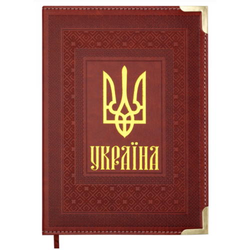 Жорстка обкладинка зі штучної шкіри щоденника STATUT багато оформлена українськими елементами. Лицьова сторона обкладинки вкрита декоративним сліпим тисненням у вигляді національних візерунків. По центру лицьової сторони методом фольгування нанесений великий золотий Тризуб. Куточки обкладинки оформлені металевими золотистими накладками. Гармонійно доповнюють дизайн щоденника сліпе тиснення року на корінці, тонований золотом зріз та декоративний шов по периметру.