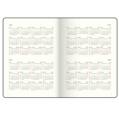Щоденники BUROMAX - це завжди широкий вибір самих різних обкладинок, фактур, розмірів і кольорів. Ми знайдемо підхід до серця кожного покупця! Гнучка обкладинка щоденника VELOUR виконана з штучної шкіри з виразним оксамитовим покриттям. Дві функціональні шильди на лицьовій та зворотній стороні обкладинки з поглибленнями для поперечної гумки забезпечують зручну та надійну фіксацію щоденника в закритому стані. Дизайн гармонійно доповнює та збагачує тонований золотим кольором зріз внутрішнього блоку та тиснення золотою фольгою року і напису на лицьовій стороні обкладинки. Формат А5 336 сторінок Внутрішній блок: офсетний папір кремового кольору щільністю 70 г/м² Закладка-лясе в колір обкладинки Перфоровані куточки аркушів Друк блоку в 2 кольори: сірий і бордовий Дві мови блоку: українська, англійська Форзаци золотого кольору Індивідуальна упаковка: картонна коробка Структура внутрішнього блоку: Сторінка для внесення особистої інформації Календарі на 2025 - 2028 роки Планінг на 2026 рік Інформаційно-довідковий блок: національні, релігійні, професійні свята та пам'ятні дати, знаки зодіаку, телефонні коди мобільних операторів та обласних центрів України, літерні автомобільні коди країн, таблиця відстаней між обласними центрами України, довідник систем вимірювання, міжнародні знаки відповідності, знаки догляду за одягом Датована сторінка на кожен день року з організатором часу від 7:00 до 21:00, календарем на поточний/наступний місяць, позначенням дня тижня, знаку зодіаку, іменинників Алфавітна книга для внесення контактів Щоденник BUROMAX формату А5 - це вибір, перевірений часом, найпопулярніший формат для незамінного помічника в плануванні Вашого робочого дня! На цій моделі щоденника можливе тиснення методом фольгування.