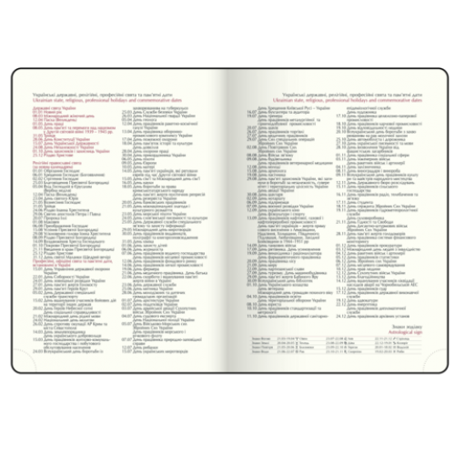 Щоденники BUROMAX - це завжди широкий вибір самих різних обкладинок, фактур, розмірів і кольорів. Ми знайдемо підхід до серця кожного покупця! Гнучка обкладинка з гладкої штучної шкіри щоденника MEMORY має 3D напис на лицьовій стороні, зроблений контрастним білим кольором. Гармонійно доповнює дизайн тонований в колір обкладинки зріз внутрішнього блоку. Формат А5 336 сторінок Внутрішній блок: офсетний папір кремового кольору щільністю 70 г/м² Закладка-лясе в колір обкладинки Перфоровані куточки аркушів Друк блоку в 2 кольори: сірий і бордовий Дві мови блоку: українська, англійська Мапи України та Європи на форзацах Індивідуальна упаковка: картонна коробка Структура внутрішнього блоку: Сторінка для внесення особистої інформації Календарі на 2025 - 2028 роки Планінг на 2026 рік Інформаційно-довідковий блок: національні, релігійні, професійні свята та пам'ятні дати, знаки зодіаку, телефонні коди мобільних операторів та обласних центрів України, літерні автомобільні коди країн, таблиця відстаней між обласними центрами України, довідник систем вимірювання, міжнародні знаки відповідності, знаки догляду за одягом Датована сторінка на кожен день року з організатором часу від 7:00 до 21:00, календарем на поточний/наступний місяць, позначенням дня тижня, знаку зодіаку, іменинників Алфавітна книга для внесення контактів Щоденник BUROMAX формату А5 - це вибір, перевірений часом, найпопулярніший формат для незамінного помічника в плануванні Вашого робочого дня! На цій моделі щоденника можливе тиснення як сліпим методом так і методом фольгування.