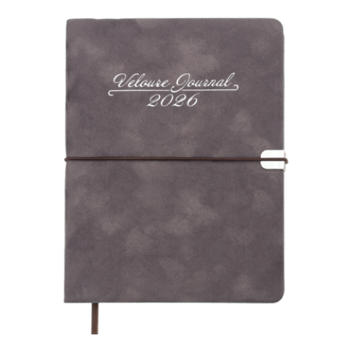 Гнучка обкладинка щоденника VELOUR виконана з штучної шкіри з виразним оксамитовим покриттям. Дві функціональні шильди на лицьовій та зворотній стороні обкладинки з поглибленнями для поперечної гумки забезпечують зручну та надійну фіксацію щоденника в закритому стані. Дизайн гармонійно доповнює та збагачує тонований срібним кольором зріз внутрішнього блоку та тиснення срібною фольгою року і напису на лицьовій стороні обкладинки.