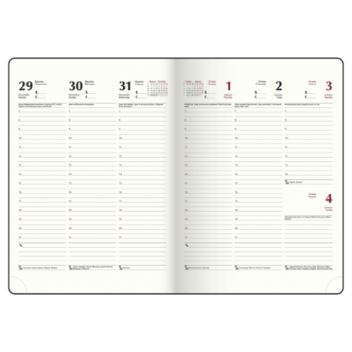 Тижневики BUROMAX - це зручний формат для щотижневого планування своїх ділових та особистих справ.   Жорстка обкладинка щотижневика BRAVO виготовлена з гладкої штучної шкіри, з поролоном. На лицьовій стороні - тиснення року сліпим методом. Тонування зрізу золотом додає вишуканий акцент. Класичний та стриманий дизайн стане відмінним доповненням корпоративного стилю компанії. Великий формат дозволяє не тільки планувати, але й робити змістовні нотатки та записи. Формат А4 136 сторінок Внутрішній блок: офсетний папір кремового кольору щільністю 70 г/м² Закладка-лясе в колір обкладинки  Перфоровані куточки аркушів Друк блоку в 2 кольори: сірий і бордовий Дві мови блоку: українська, англійська Мапи України та Європи на форзацах Індивідуальна упаковка: картонна коробка Структура внутрішнього блоку: Сторінка для внесення особистої інформації Календарі на 2025 - 2028 роки Планінг на 2026 рік Інформаційно-довідковий блок: національні, релігійні, професійні свята та пам'ятні дати, знаки зодіаку, телефонні коди мобільних операторів та обласних центрів України, літерні автомобільні коди країн, таблиця відстаней між обласними центрами України, довідник систем вимірювання, міжнародні знаки відповідності, знаки догляду за одягом На одній сторінці вертикально розміщено три/чотири дні тижня (субота і неділя - вертикальне розташування на одній частині), з організатором часу від 7:00 до 21:00, вказівкою місяця, року, дня тижня та дати, календар на поточний/наступний місяць, іменинники, знаки зодіаку, свята та пам'ятні дати Алфавітна книга для внесення контактів Щотижневик BUROMAX - незамінний помічник в плануванні Вашого робочого часу! На цій моделі щотижневика можливе тиснення сліпим методом і методом фольгування.