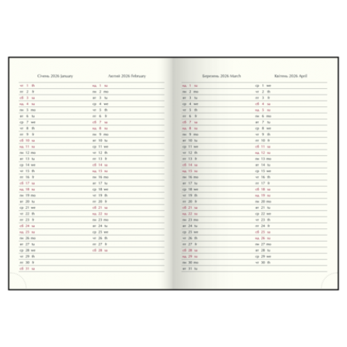 Тижневики BUROMAX - це зручний формат для щотижневого планування своїх ділових та особистих справ.   Жорстка обкладинка зі штучної шкіри щотижневика ORION водночас оригінальна та лаконічна. Фактура обкладинки імітує фактуру натуральної шкіри. Гармонійно доповнює дизайн обкладинки сліпе тиснення року на лицьовій стороні та декоративний шов по периметру та поперек обкладинки. Великий формат дозволяє не тільки планувати, але й робити змістовні нотатки та записи. Формат А4 136 сторінок Внутрішній блок: офсетний папір кремового кольору щільністю 70 г/м² Закладка-лясе в колір обкладинки  Перфоровані куточки аркушів Друк блоку в 2 кольори: сірий і бордовий Дві мови блоку: українська, англійська Мапи України та Європи на форзацах Індивідуальна упаковка: картонна коробка Структура внутрішнього блоку: Сторінка для внесення особистої інформації Календарі на 2025 - 2028 роки Планінг на 2026 рік Інформаційно-довідковий блок: національні, релігійні, професійні свята та пам'ятні дати, знаки зодіаку, телефонні коди мобільних операторів та обласних центрів України, літерні автомобільні коди країн, таблиця відстаней між обласними центрами України, довідник систем вимірювання, міжнародні знаки відповідності, знаки догляду за одягом На одній сторінці вертикально розміщено три/чотири дні тижня (субота і неділя - вертикальне розташування на одній частині), з організатором часу від 7:00 до 21:00, вказівкою місяця, року, дня тижня та дати, календар на поточний/наступний місяць, іменинники, знаки зодіаку, свята та пам'ятні дати Алфавітна книга для внесення контактів Щотижневик BUROMAX - незамінний помічник в плануванні Вашого робочого часу! На цій моделі щотижневика можливо тиснення сліпим методом та методом фольгування.