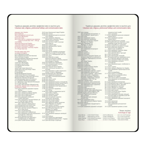 Інформаційно-довідковий блок: національні, релігійні, професійні свята та пам'ятні дати, знаки зодіаку, телефонні коди мобільних операторів та обласних центрів України, літерні автомобільні коди країн, таблиця відстаней між обласними центрами України, довідник систем вимірювання, міжнародні знаки відповідності, знаки догляду за одягом
