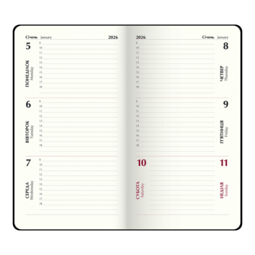 На одній сторінці горизонтально розміщено три/чотири дні тижня (субота і неділя - вертикальне розташування на одній частині), з організатором часу від 9:00 до 18:00, вказівкою місяця, року, дня тижня та дати
