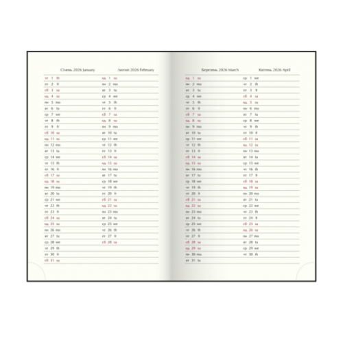 Тижневики BUROMAX - це зручний формат для щотижневого планування своїх ділових та особистих справ.   Гнучка обкладинка щотижневика IDEAL виконана з штучної шкіри з фактурою натуральної шкіри. Гармонійно доповнює дизайн тиснення року на лицьовій стороні обкладинки та тонований зріз внутрішнього блоку в колір обкладинки. Формат А5 136 сторінок Внутрішній блок: офсетний папір кремового кольору щільністю 70 г/м² Закладка-лясе в колір обкладинки Перфоровані куточки аркушів Друк блоку в 2 кольори: сірий і бордовий Дві мови блоку: українська, англійська Мапи України та Європи на форзацах Індивідуальна упаковка: картонна коробка Структура внутрішнього блоку: Сторінка для внесення особистої інформації Календарі на 2025 - 2028 роки Планінг на 2026 рік Інформаційно-довідковий блок: національні, релігійні, професійні свята та пам'ятні дати, знаки зодіаку, телефонні коди мобільних операторів та обласних центрів України, літерні автомобільні коди країн, таблиця відстаней між обласними центрами України, довідник систем вимірювання, міжнародні знаки відповідності, знаки догляду за одягом На одній сторінці горизонтально розміщено три/чотири дні тижня (субота і неділя - вертикальне розташування на одній частині), з організатором часу від 9:00 до 18:00, вказівкою місяця, року, дня тижня та дати Алфавітна книга для внесення контактів Щотижневик BUROMAX - незамінний помічник в плануванні Вашого робочого часу! На цій моделі щотижневика можливо тиснення сліпим методом і методом фольгування.