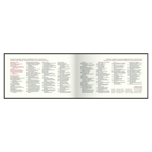 На одній сторінці вертикально розміщено три/чотири дні тижня, з організатором часу від 8:00 до 20:00, вказівкою місяця, дня тижня та дати, іменинників, знаку зодіаку, свят та пам'ятних дат