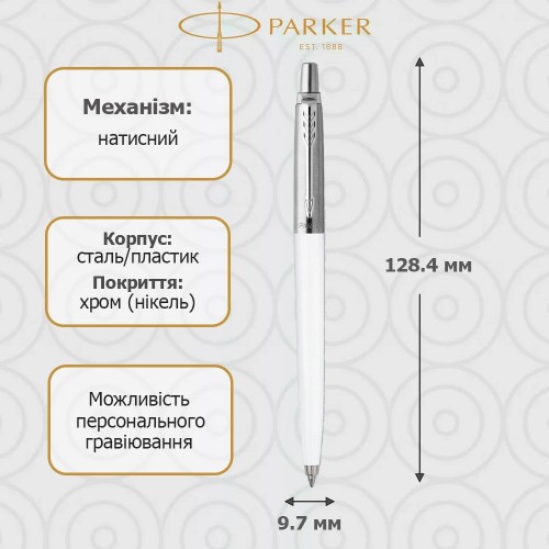 Parker Jotter 17 Standard White BP 15 032 - класичний пишучий інструмент, що поєднує в собі позачасовий дизайн та сучасну функціональність. Ця ручка має гладкий білий корпус зі сталевими вставками на затиску та кінчику ручки, що надає їй елегантного та витонченого вигляду.