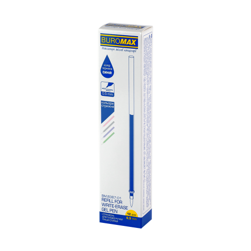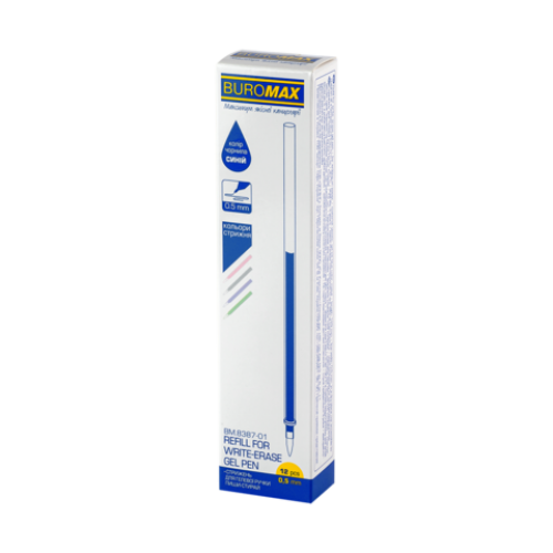 Стрижні від BUROMAX – змінні елементи для ручок. Стрижень для гелевої ручки "пиши-стирай" продовжить термін служби Вашої улюбленої ручки та заощадить Ваші гроші! корпус стрижнів виконаний в пастельних кольорах асорті (рожевий, блакитний, лавандовий, м'ятний), добре поєднується з ручками з прозорого пластику товщина лінії письма 0,5 мм довжина стрижня 129 мм колір чорнила синій основа чорнила гелева - для легкого та плавного письма (має оптимальні показники в'язкості, що забезпечує його рівномірну подачу при письмі, чітку насичену лінію письма при мінімальному натиску) особливість чорнила - написи знебарвлюються під дією температури або тертя (для знебарвлення достатньо потерти напис спеціальною гумкою на корпусі ручки) чорнило швидко висихає та не розмазується  підходить для неавтоматичних гелевих ручок арт.  BM.8310-01, BM.8313-01, BM.8312-01 кожен стрижень в індивідуальному пакетику із завісою упаковка: 12 шт. у картонній коробці в кольорах асорті