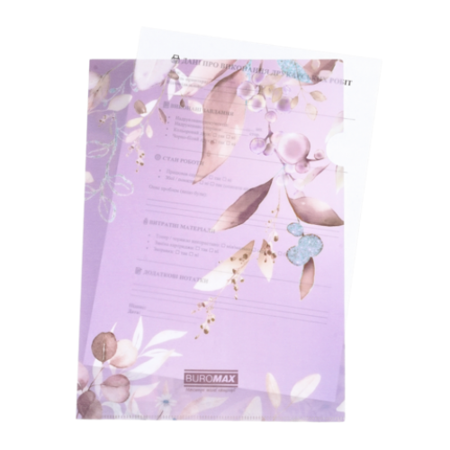 Папка-кутик серії ARABESKI від BUROMAX допоможе акуратно та стильно організувати Ваші ділові папери. Підійде для короткочасного зберігання невеликої кількості документів. Її зручно використовувати для здачі звітності, на нарадах або просто в роботі бухгалтерів, фінансистів, менеджерів, маркетологів та інших співробітників. Папка стане в нагоді співробітникам офісних та бізнес-центрів, фінансових відділів та установ, студентам та школярам, ​​захистить вміст від зминання, намокання або забруднення. для паперів формату А4 (розмір 220х310 мм) матеріал: матовий напівпрозорий пластик товщиною 180 мкм наявність висікання на лицьовій стороні допомагає швидко та зручно витягнути документи з папки місткість: до 40 аркушів виконана в оригінальному квітковому дизайні з блиском, що іскриться на світлі основний колір: сливовий Придбайте інші канцтовари серії ARABESKI, з квітковими та пастельними дизайнами та зберіть власну унікальну колекцію, яка підкреслить Ваш стиль та смак і обов'язково радуватиме погляд!