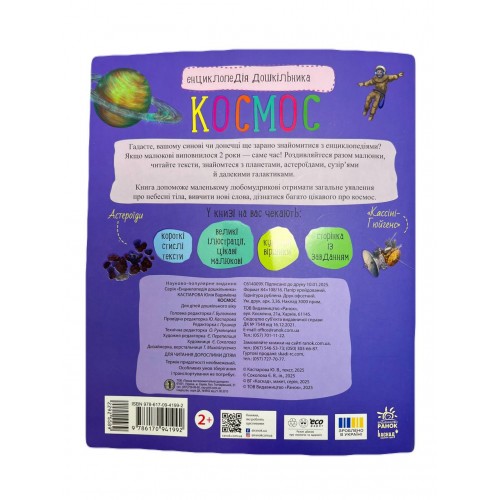 Ви думаєте, вашому синові чи доньці ще рано знайомитися з енциклопедіями? Якщо малюкові вже виповнилося 2 роки - саме час! Книга допоможе дитині отримати загальне уявлення про космос та його мешканців. Розглядайте разом картинки, вивчайте нові слова та дізнайтесь багато нового!