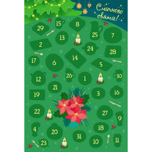 Адвент “Накриваємо на стіл” – для всіх любителів кулінарного чародійства. Календар містить 31 смачний та простий рецепт на кожен день очікування свята. Можна готувати разом з дітьми та створювати свої власні сімейні традиції. До складу входить основа-святковий стіл, куди щодня додається одна наліпка з приготованою стравою.