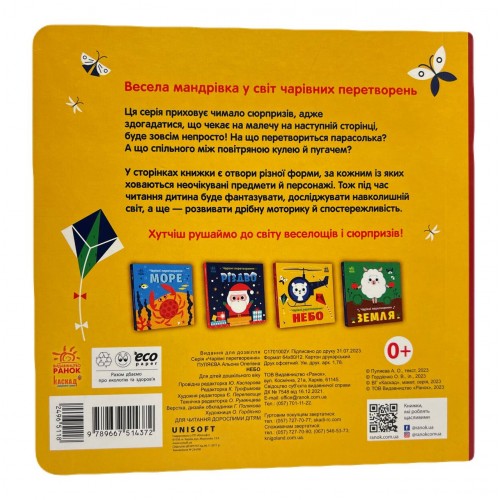 Серія «Чарівні перетворення» приховує чимало сюрпризів, адже здогадатися, що чекає на малечу на наступній сторінці, буде зовсім непросто! На що перетвориться парасолька? А що спільного між повітряною кулею й пугачем? Гортайте сторіночки, щоб дізнатися!
