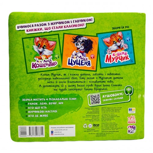 Котик Мурчик, як і кожна маленька дитина, завзято і невтомно досліджує навколишній світ. Тому разом з Мурчиком дитина легко й охоче вчитиметься і пізнаватиме нове. А допоможуть їй у цьому веселі ігрові вірші Ірини Сонечко та чудові ілюстрації Галини Бродської. Збірка містить 4 пізнавальні теми: Ранок, день, вечір, ніч Хто що їсть Мурчикові настрої Хто де живе.