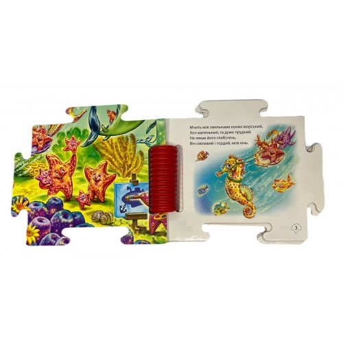 Не треба більше купувати окремо книгу, окремо набір пазлів, бо наша книга-пазл стала чудовим поєднанням цих двох видів дитячого дозвілля. Разом з героями цієї книги вітаємо Вас у дружній атмосфері веселих ігор та цікавих розваг посеред морських хвиль, картинка яких складається з восьми великих пазл-аркушів.Сім чудових віршів про мешканців океану. Вісім великих цупких та зручних для малюка пазлів? які складаються у картинку-панно розміром 65х30см. Й це ще не все, бо аналогів такій книзі в Україні немає.