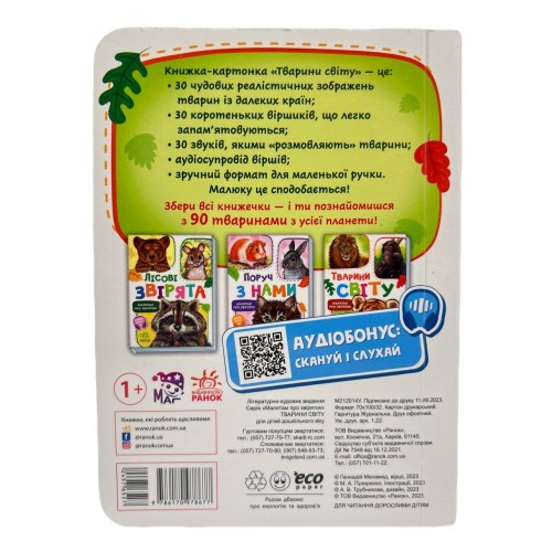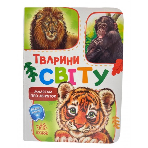 Книжка-картонка «Тварини світу» це: 30 чудових реалістичних зображень тварин із далеких країн; 30 коротеньких віршиків, що легко запам'ятовуються; 30 звуків, якими «розмовляють» тварини; аудіо-супровід віршів; зручний формат для маленької ручки. Малюку це сподобається!