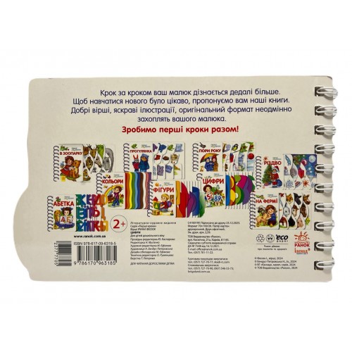 Картонки серії мають цікавий незвичайний формат: з обкладинки на вас «дивляться» всі герої, які визирають зі сторінок. Добрі вірші, яскраві ілюстрації, оригінальний формат обов’язково захоплять вашого малюка. Нехай дитина пізнає світ із «Першими кроками»! Видання призначене для дітей молодшого дошкільного віку