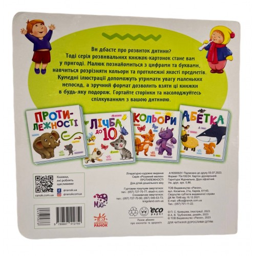 Книга "Протилежності. Розумний малюнок" Наші переваги - Гарантія якості - Доставка 1-3 дні - Відсилання без передоплати - Оплата у разі отримання або на карту Книга "Протилежності. Розумний малюнок" Ви дбаєте про розвиток дитини? Тоді серія розвивальних книг-картонок стане в пригоді вам. Малюк познайомиться з цифрами та літерами, навчиться розрізняти кольори та протилежні якості предметів. Кумедні ілюстрації допоможуть утримати увагу маленьких непосид, а зручний формат книг дасть змогу взяти ці книги в будь-яку подорож. Позбавляйте сторінки та насолоджуйтеся спілкуванням із вашою дитиною. Палітурка - тверда